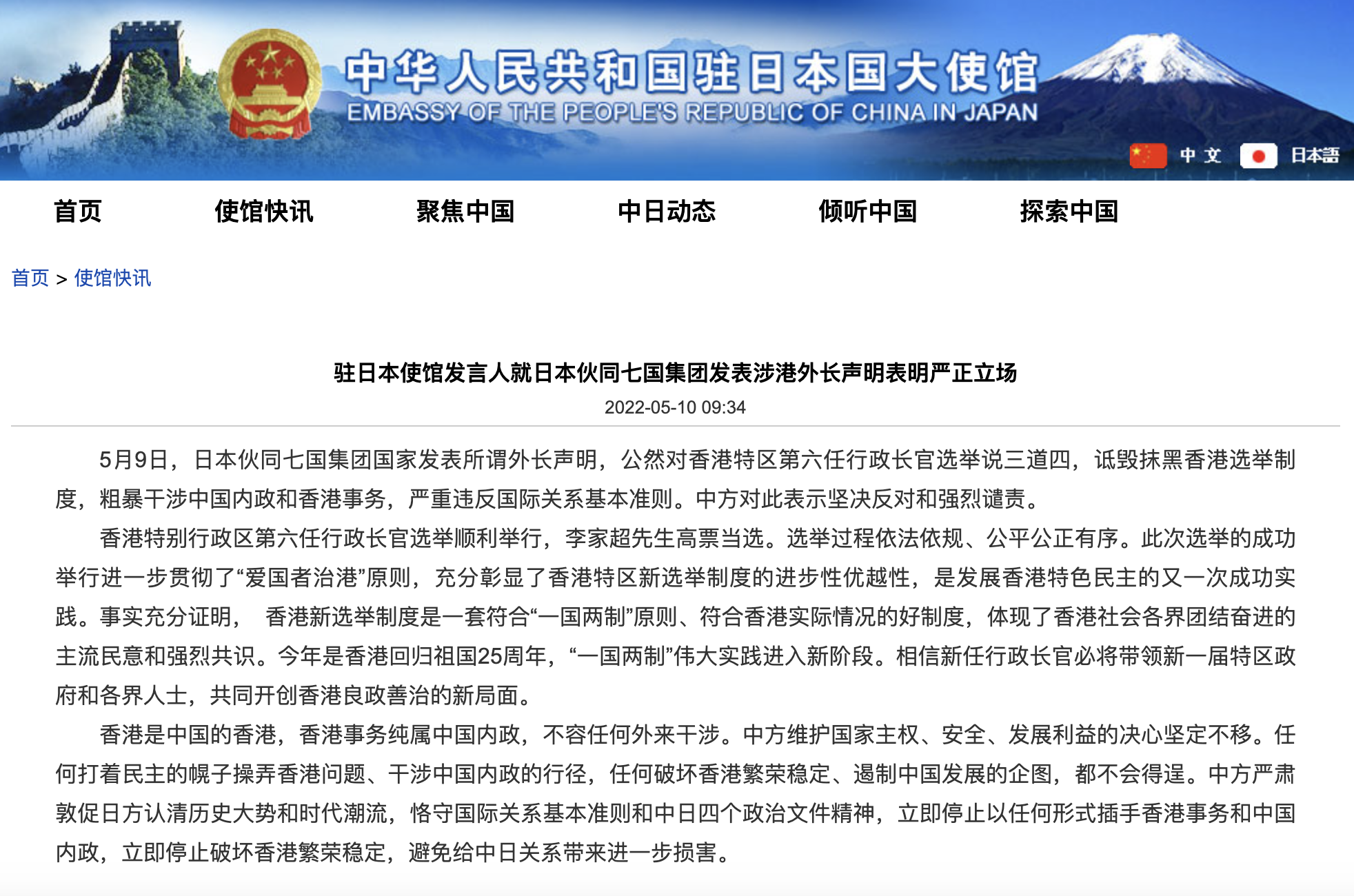 5月9日,日本伙同七国集团国家发表所谓外长声明,公然对香港特区第六任行政长官选举说三道四,诋毁抹黑香港选举制度,粗暴干涉中国内政和香港事务,严重违反国际关系基本准则。中方对此表示坚决反对和强烈谴责。