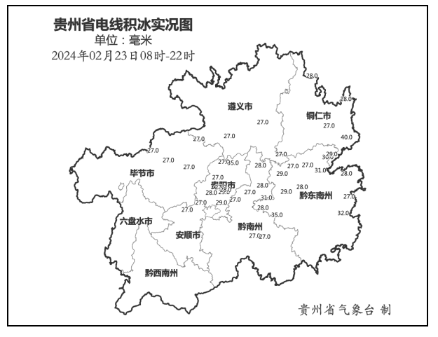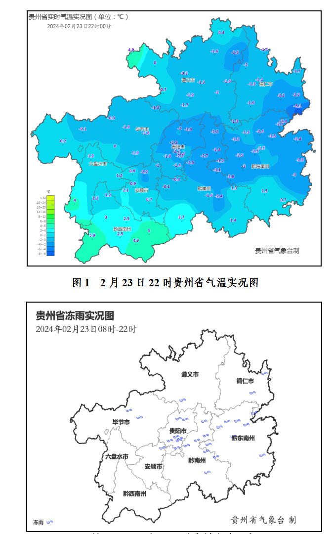 据2月23日22时监测显示,全省80个县(市、区)气温在2°C以下,59个县(市、区)在0°C以下,最低为万山-6.1°C,贵阳市城区为-2.2°C。2月23日08时至14时,岑巩、江口、习水、台江、开阳、麻江、天柱共7个县出现降雪,未形成积雪; 中部一带共28个县(市、区)出现冻雨;铜仁市东部、黔东南州中北部、遵义市南部、毕节市中东部、贵阳市、黔南州中北部共41个县(市、区)出现电线积冰,积冰最大直径为万山40毫米(含导线直径 26.8 毫米);全省11个观测站出现8级以上大风,最大风速为威宁麻乍27.5 米/秒(10级),省内大部分地区出现小雨。