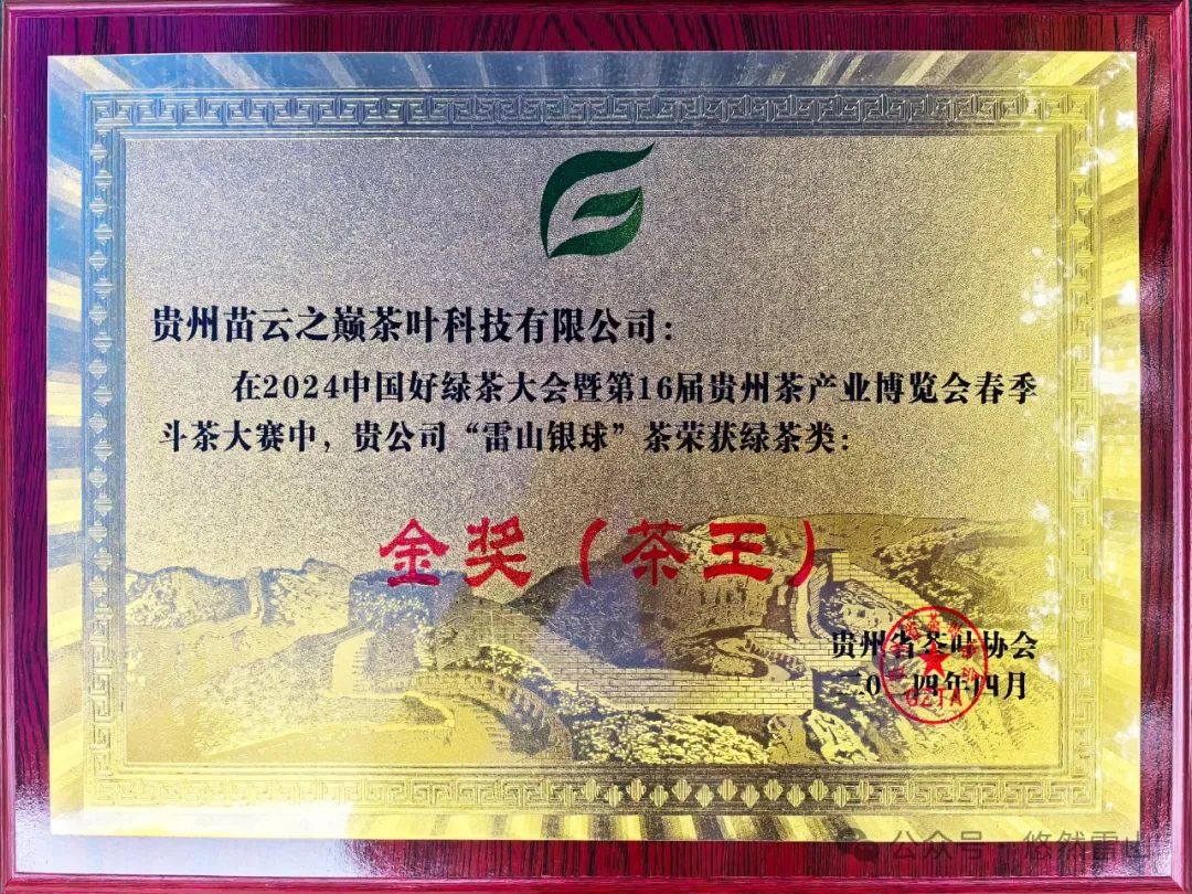 4月18日,在贵州省湄潭县中国茶城举办的2024中国好绿茶大会暨第16届贵州茶产业博览会春季斗茶大赛中,国家地理标志保护产品雷山银球茶荣获绿茶类金奖茶王。