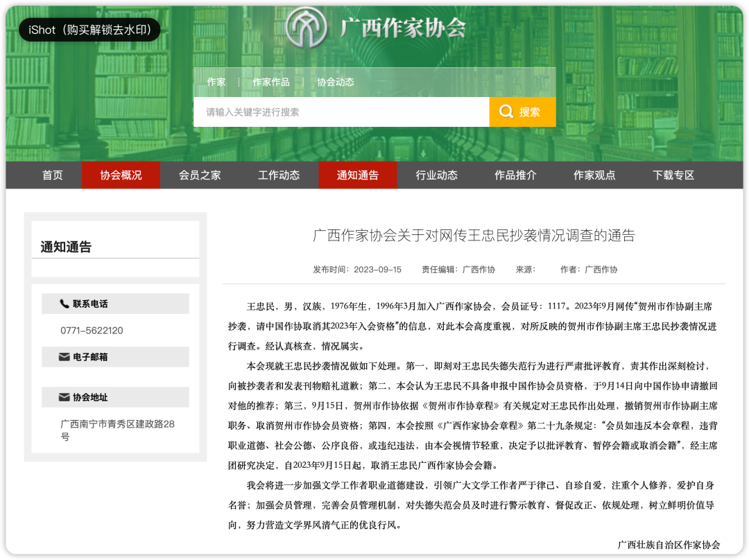 广西作协15日通报,王忠民,男,汉族,1976年生,1996年3月加入广西作家协会,会员证号:1117。2023年9月网传“贺州市作协副主席抄袭,请中国作协取消其2023年入会资格”的信息,广西作协对此高度重视,对所反映的贺州市作协副主席王忠民抄袭情况进行调查。经认真核查,情况属实。