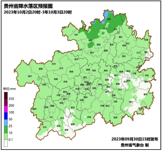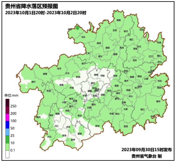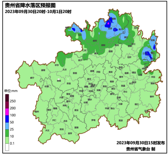 9月29日08时至9月30日08时,贵州省的西部北部地区多云午后到夜间有阵雨或雷雨,其余地区多云有分散阵雨。