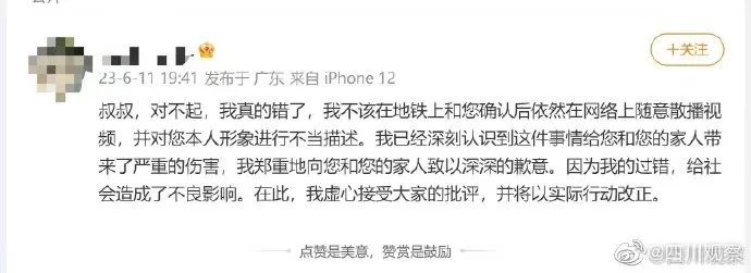6月11日晚,当事女子@注册不了张z 发微博道歉称,“叔叔,对不起,我真的错了,我不该在地铁上和您确认后依然在网络上随意散播视频,并对您本人形象进行不当描述。我已经深刻认识到这件事情给您和您的家人带来了严重的伤害,我郑重地向您和您的家人致以深深的歉意。因为我的过错,给社会造成了不良影响。在此,我虚心接受大家的批评,并将以实际行动改正。”