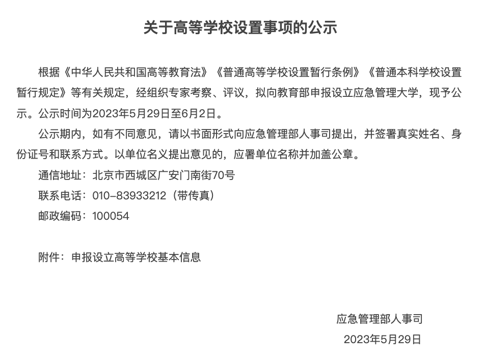 5月29日,据应急管理部官网消息,根据《中华人民共和国高等教育法》《普通高等学校设置暂行条例》《普通本科学校设置暂行规定》等有关规定,经组织专家考察、评议,拟向教育部申报设立应急管理大学,现予公示。