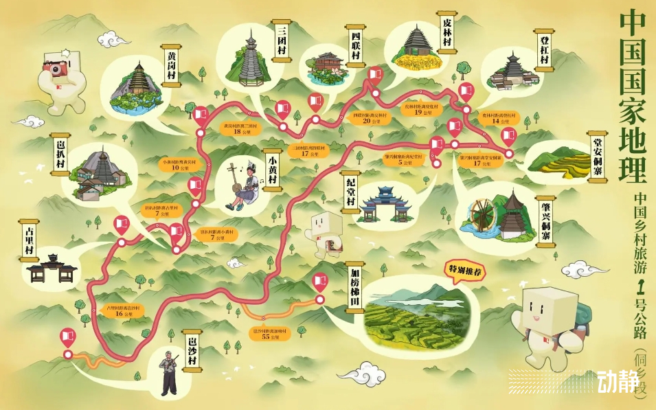 今年5月1日,黔东南州与《中国国家地理》联合推出“中国乡村旅游1号公路”。公路包含侗乡传统村落旅游精品环线和苗岭传统村落旅游精品射线,串联着“锦绣黔东南”的“三山三江”和“苗乡侗寨”,彰显了“村BA”“村超”等人文气息;其中,侗乡传统村落旅游精品环线全长135公里,沿线将包含神奇古寨、磅礴梯田、茫茫林海等景观。