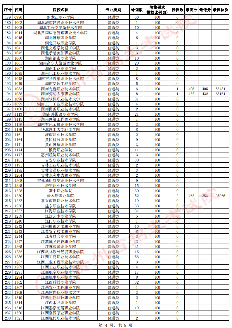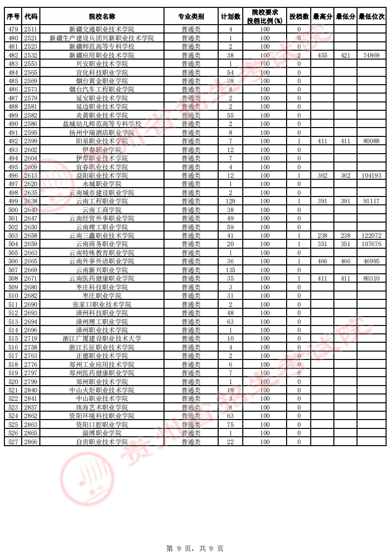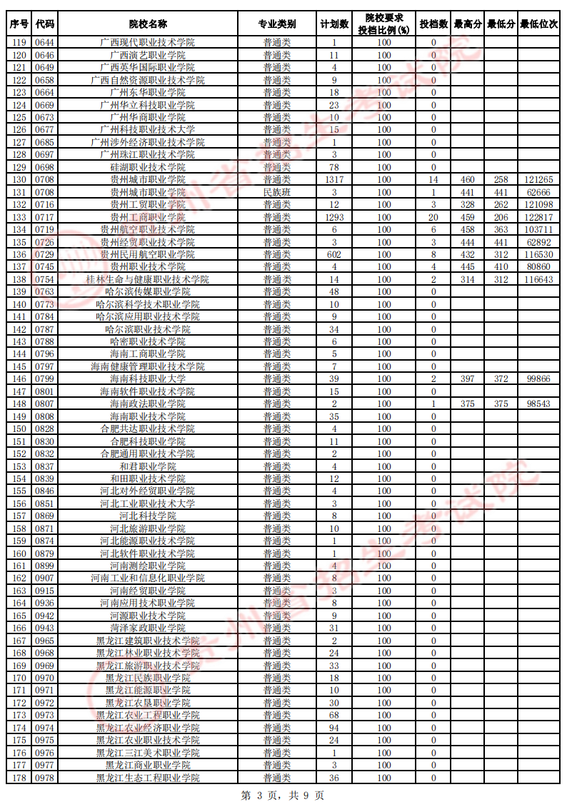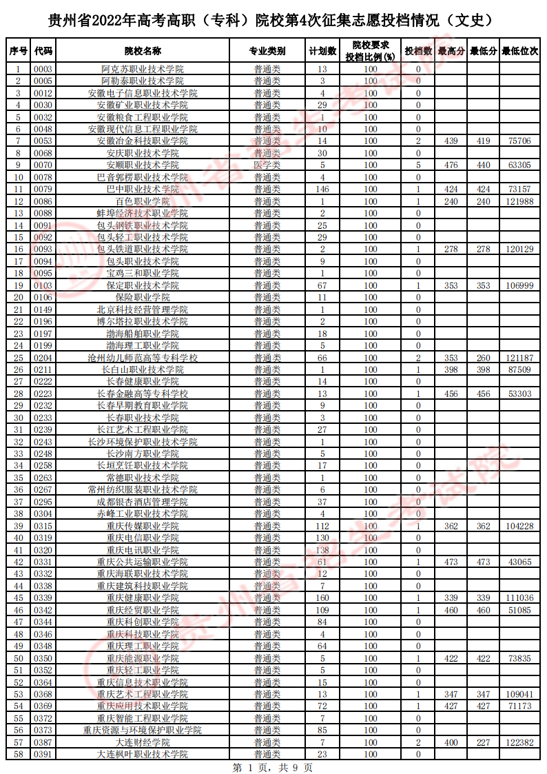 贵州省高考高职(专科)院校第4次征集志愿投档情况(理工类)
