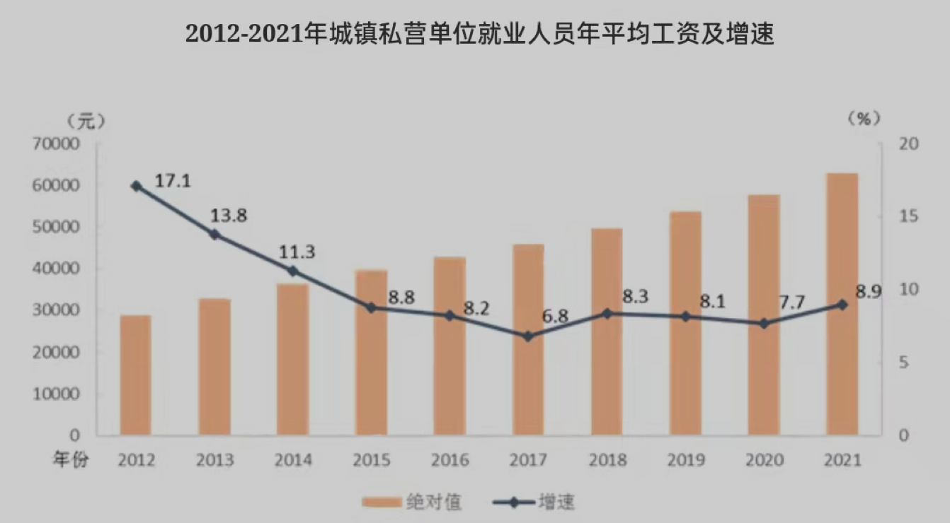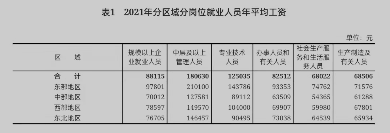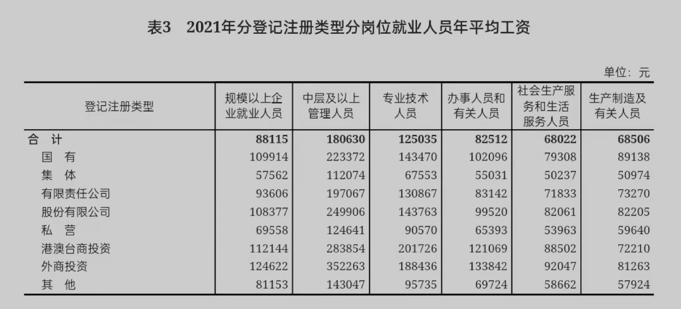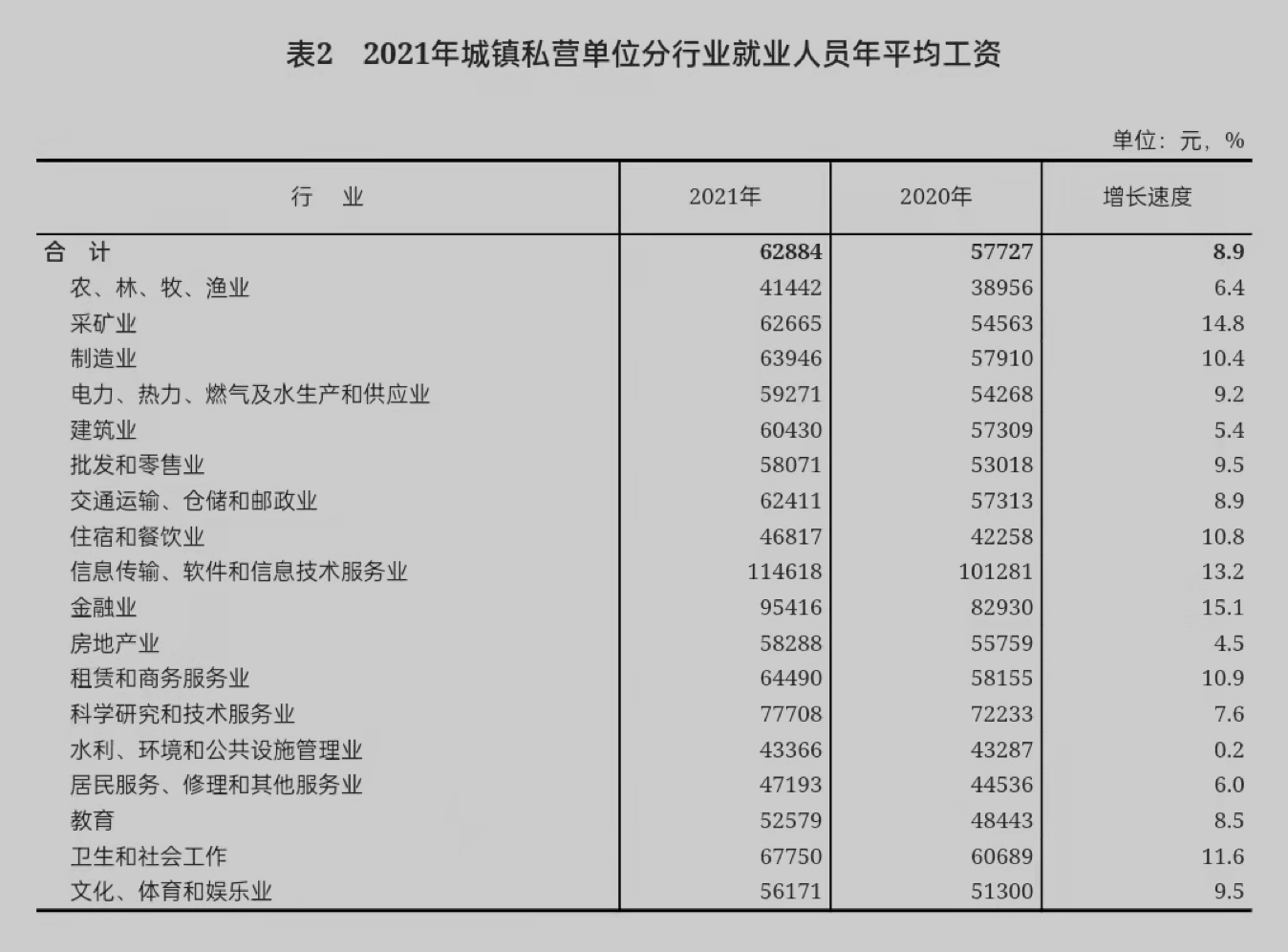 2021年全国城镇非私营单位就业人员年平均工资为106837元,首次超过10万元,比上年增长9.7%,增速比2020年提高2.1个百分点,扣除价格因素实际增长8.6%;城镇私营单位就业人员年平均工资为62884元,比上年增长8.9%,增速提高1.2个百分点,扣除价格因素实际增长7.8%。本文所指的城镇单位是指城镇地域内从业人员在5人及以上法人单位,不包括个体工商户和自由职业者;所指的工资包括实发到手的工资、奖金和各类津补贴,以及单位从个人工资中代扣代缴的个人所得税、社会保险基金和住房公积金等个人缴纳部分。