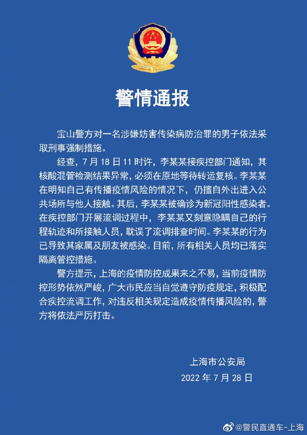 7月28日,据上海市公安局消息,宝山警方对一名涉嫌妨害传染病防治罪的男子依法采取刑事强制措施。