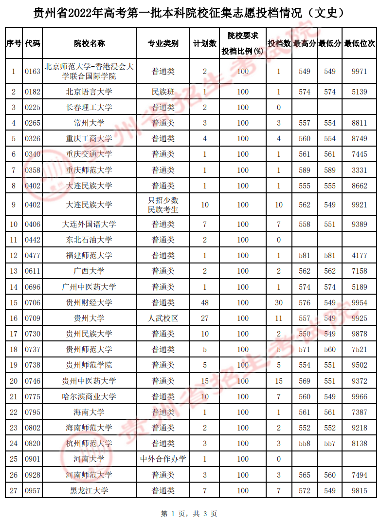 贵州省2022年高考7月22日第一批本科院校录取情况