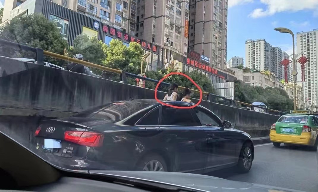 7月3日,毕节市公安局七星关分局交警大队接到群众图片举报称,在城区百里杜鹃路区医院路段,两辆行驶中的小轿车车窗外分别钻出了2名小孩和1名小孩,相互之间隔空交流,不时还做起了“手势舞”,让人看得直揪心。