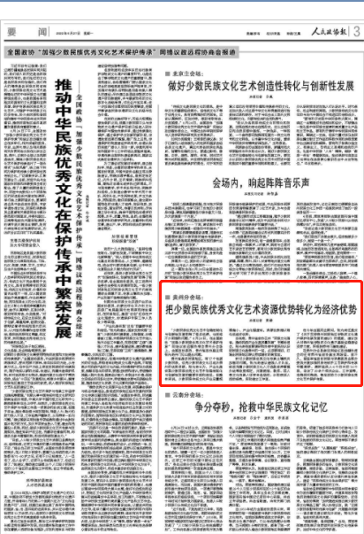 针对少数民族优秀文化传承土壤流失加剧的问题,张光奇建议建强人才队伍,修改完善少数民族文化人才选拔培养管理办法等政策规定,开展绣娘、歌师、匠人等文化传承人评审命名活动,补助获评人活动经费,资助建立工作室。