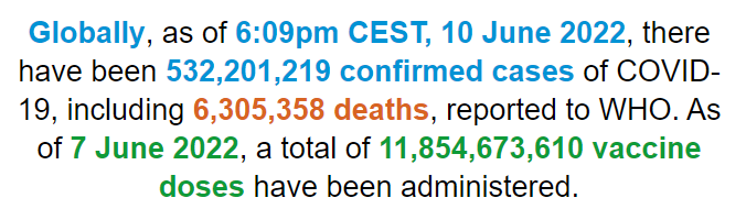 根据世卫组织最新实时统计数据,截至欧洲中部夏令时间6月10日18时09分(北京时间6月11日0时09分),全球累计新冠肺炎确诊病例532201219例,累计死亡病例6305358例。10日全球新冠肺炎确诊病例新增574365例,死亡病例新增2160例。