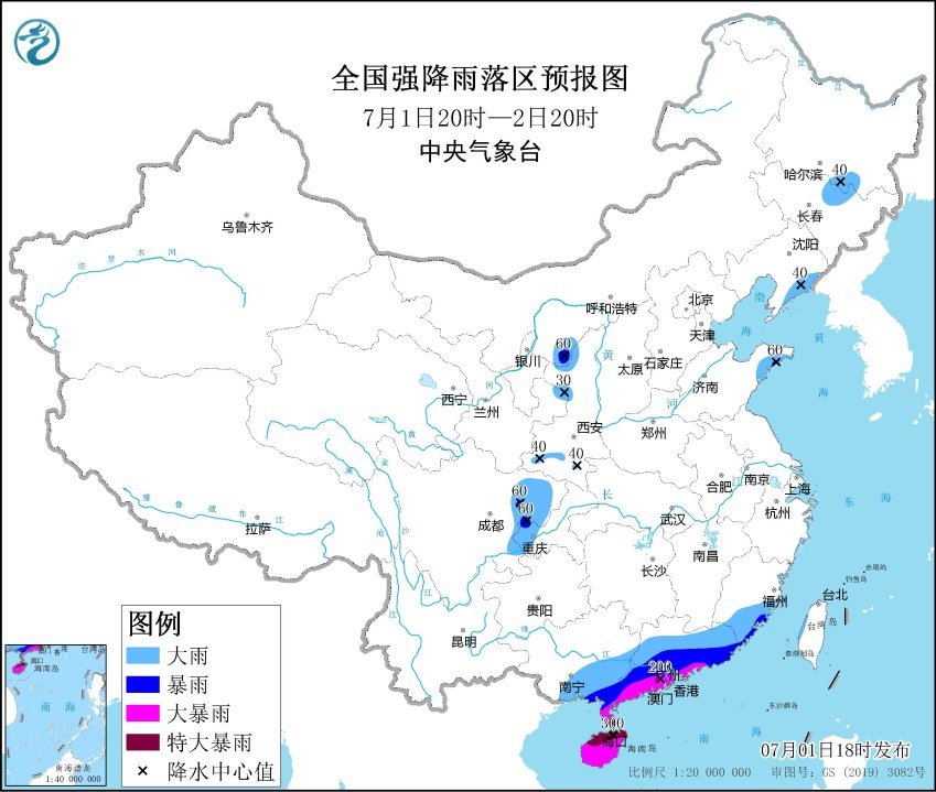 中央气象台7月1日18时继续发布暴雨黄色预警:预计,7月1日20时至2日20时,广东大部、广西东南部、海南岛、福建东南部以及四川盆地东部、陕西北部、辽宁东南部、山东半岛等地部分地区有大到暴雨,其中,广东沿海、海南岛等地部分地区有大暴雨,广东西南部沿海、海南岛北部等地局地特大暴雨(250~300毫米);上述部分地区伴有短时强降水,局地有雷暴大风等强对流天气;华南最大小时降雨量40~60毫米,局地可超过80毫米。