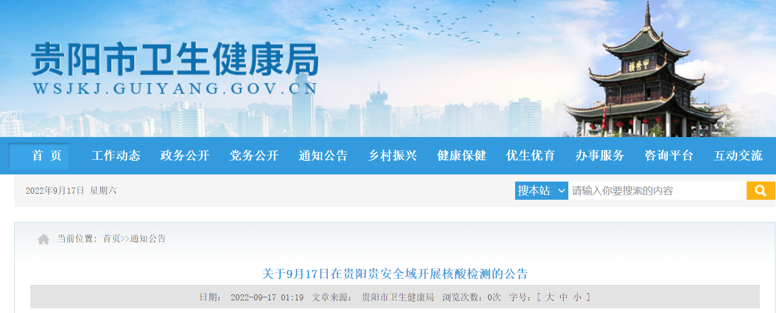 根据贵阳贵安当前疫情防控形势,经贵阳市疫情防控现场处置省市联动指挥部研究,决定于2022年9月17日在贵阳贵安继续开展全域核酸检测。现将有关事宜通告如下:
