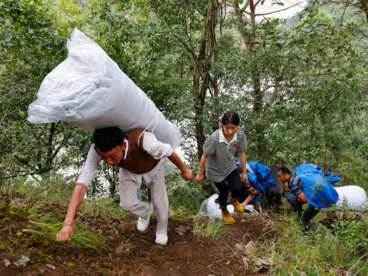 9月8日上午,武警四川省总队官兵和四川消防救援人员从泸定县磨西镇出发,分批次通过便道向受灾的龙坝尾村、青岗坪村群众送去饮用水、食物、药品等物资,缓解被困群众的生活困难。