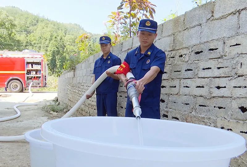 县消防救援大队第一时间成立了“抗旱保饮水突击队”奔赴在村村寨寨,把清澈的饮用水送到百姓家门口。涓涓细水汇聚成大爱,润泽了百姓心田。截至目前,县消防救援大队累计出动消防车辆45台次、消防员200多人次,为村民们送去生产生活用水200余吨,有效缓解了因高温天气出现的人畜用水难问题。
