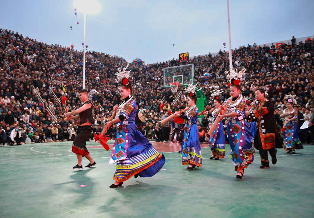 ↑演员在铜仁队与黔东南队的比赛开始前表演节目。新华社记者 刘续 摄