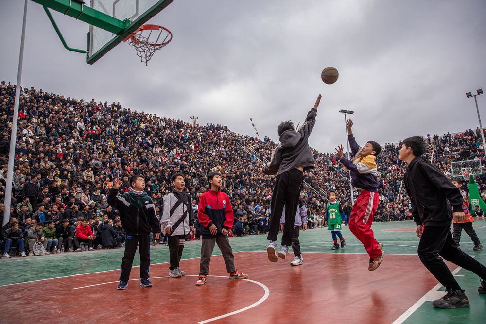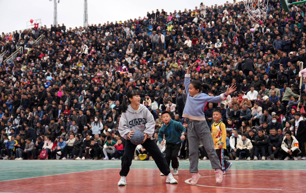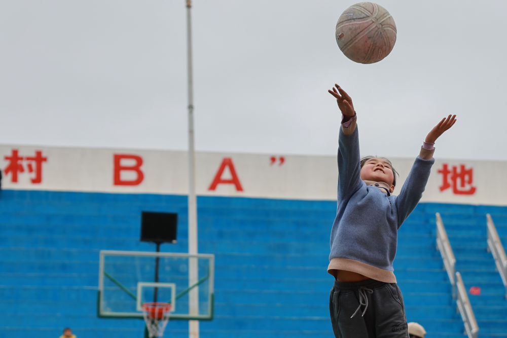 ↑3月25日,台盘村的小朋友在比赛前打篮球。