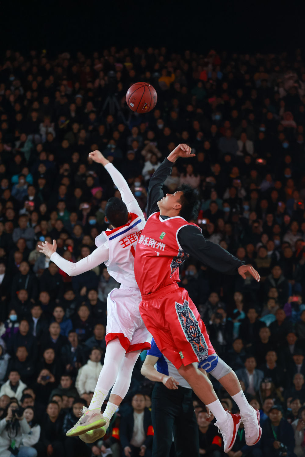 ↑黔东南队球员解涛(右)和铜仁队球员王连波在比赛中跳球。新华社记者 刘续 摄