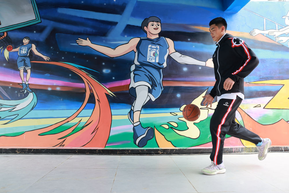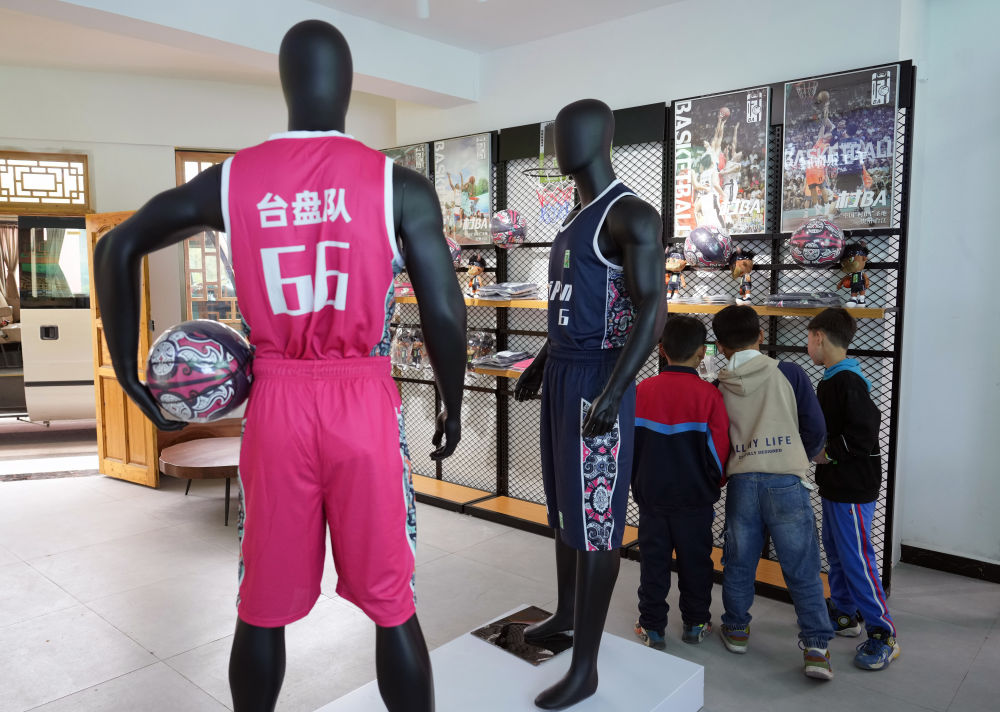 ↑3月25日,几名男孩正在台盘村的“村BA官方线下体验馆”里参观。