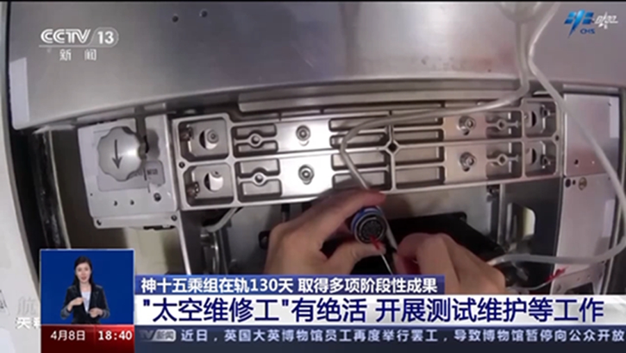 现在看到的是航天员张陆正在使用残渣收集器,清理太空跑台。中国空间站为满足长寿命要求,会以定期维护、定期维修、适时维修的原则,根据空间站内的各产品的具体情况进行预防性维修维护。这也是保证航天员在轨安全、空间站正常可靠运行、优化空间站设计、降低运营费用和延长空间站寿命的一种有效手段。