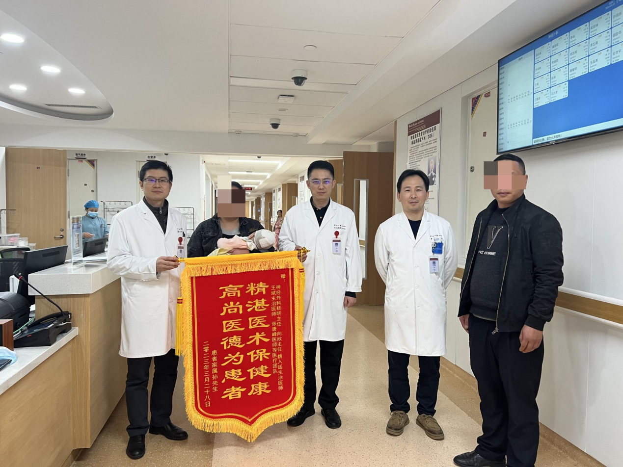 年年送花到海港,岁岁手上留余香。3月28日,这对于患儿小芯(化名)和她的父母都是及其重要的日子,当天小芯的伤口顺利拆线出院了。一早小芯的父母就带着写有“精湛医术保健康 高尚医德为患者”的锦旗来到神经外科,将锦旗交予神经外科向欣主任医师和杨明副主任医师手上,感谢神经外科团队医护们精湛的医术和贴心的服务,给患儿的生活带来新的希望。