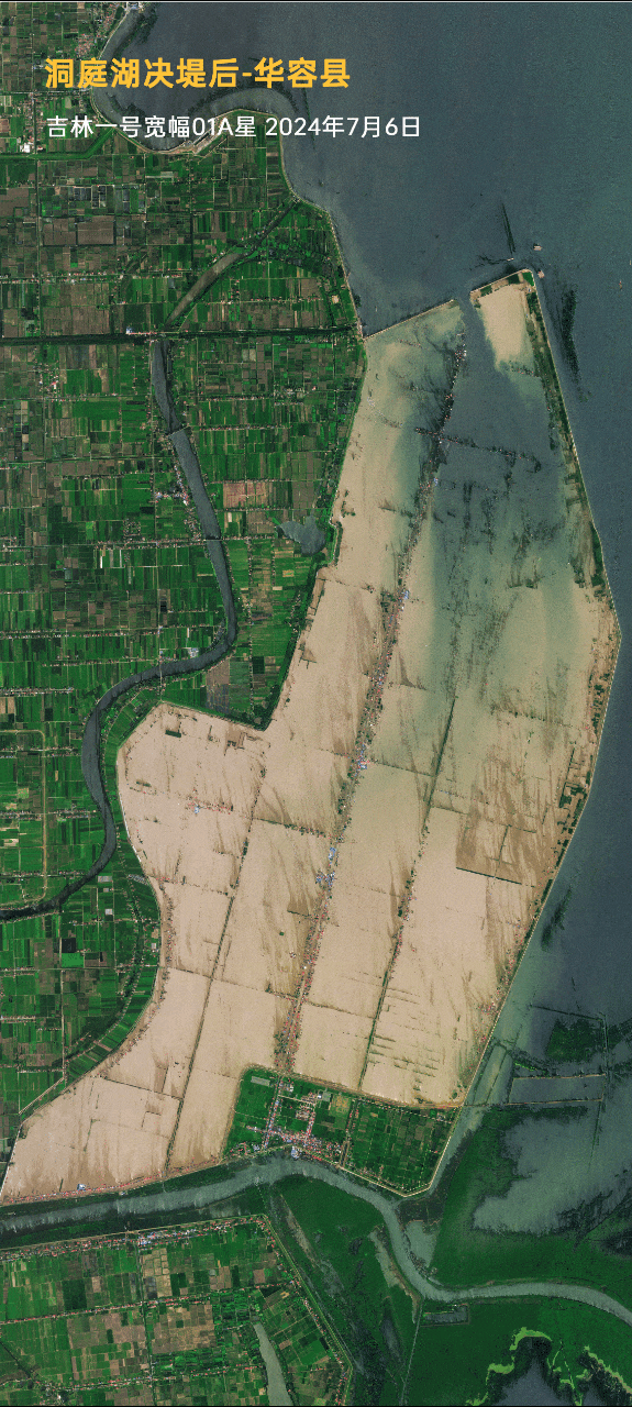 为掌握受灾区域实时情况,长光卫星紧急调度“吉林一号”宽幅01A星过境岳阳华容县,对灾区进行观测;并在成像后第一时间提供给相关单位,助力抗洪救灾工作。