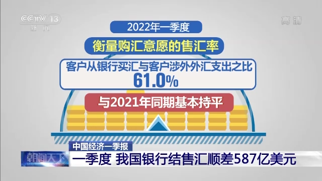 2022年一季度,我国银行结售汇顺差587亿美元,银行代客涉外收支顺差622亿美元,银行结售汇和跨境收支均保持合理规模顺差。