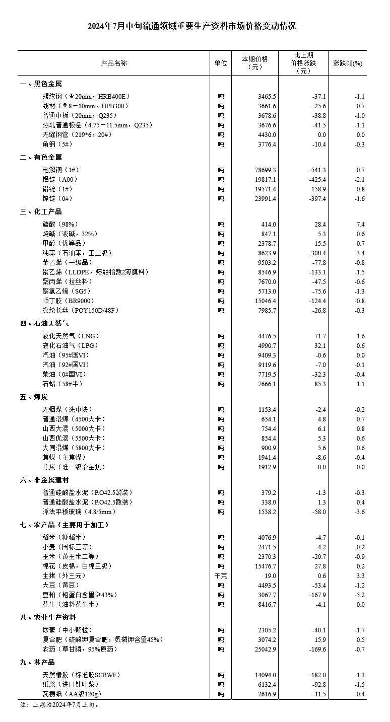据国家统计局网站消息,据对全国流通领域9大类50种重要生产资料市场价格的监测显示,2024年7月中旬与7月上旬相比,15种产品价格上涨,31种下降,4种持平。