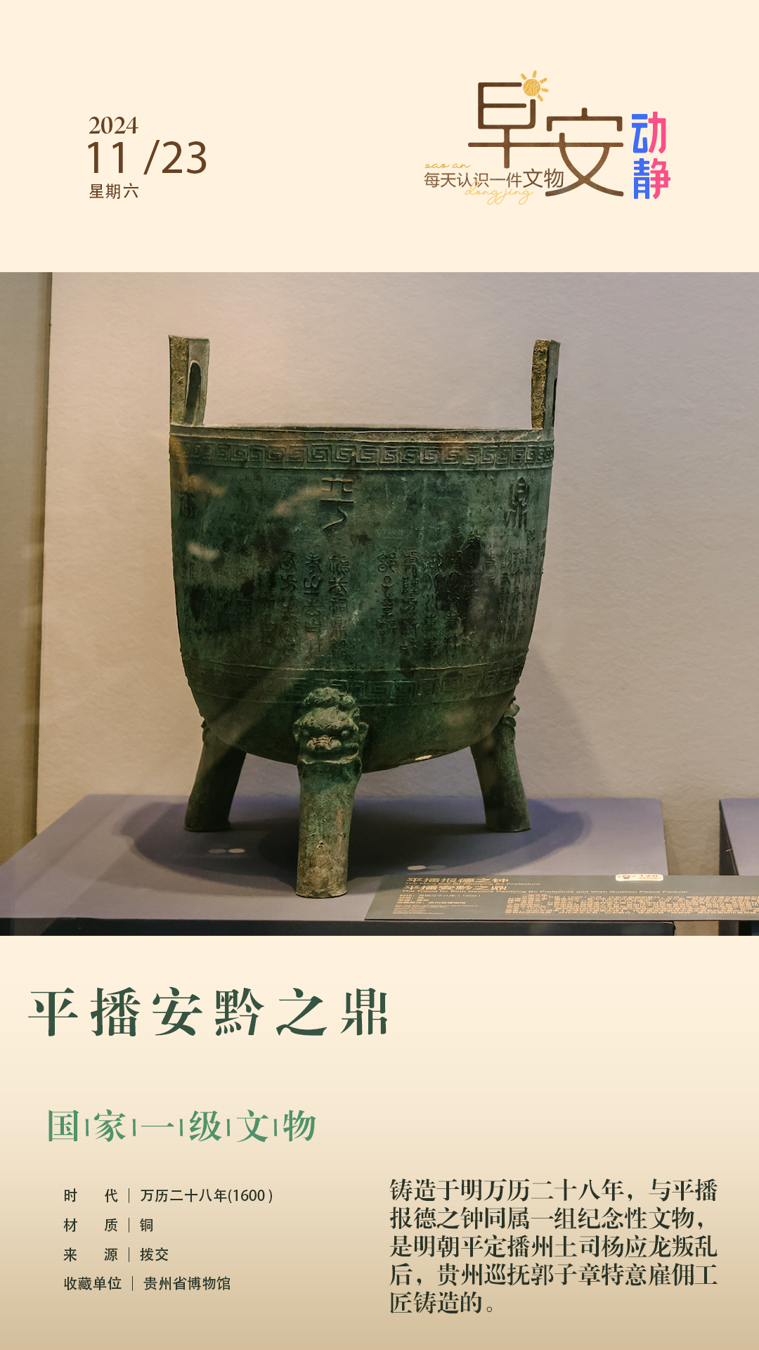 平播安黔之鼎作为明朝中央政府平定播州叛乱、加强对西南地区统治的重要象征,该鼎反映了当时的政治格局和民族关系,以及 “改土归流” 这一重要历史事件的背景和意义。它与平播报德之钟相互呼应,共同见证了明朝在西南地区的统治策略和历史变迁,对研究明朝的地方治理、民族政策以及土司制度的演变等方面具有重要的参考价值。