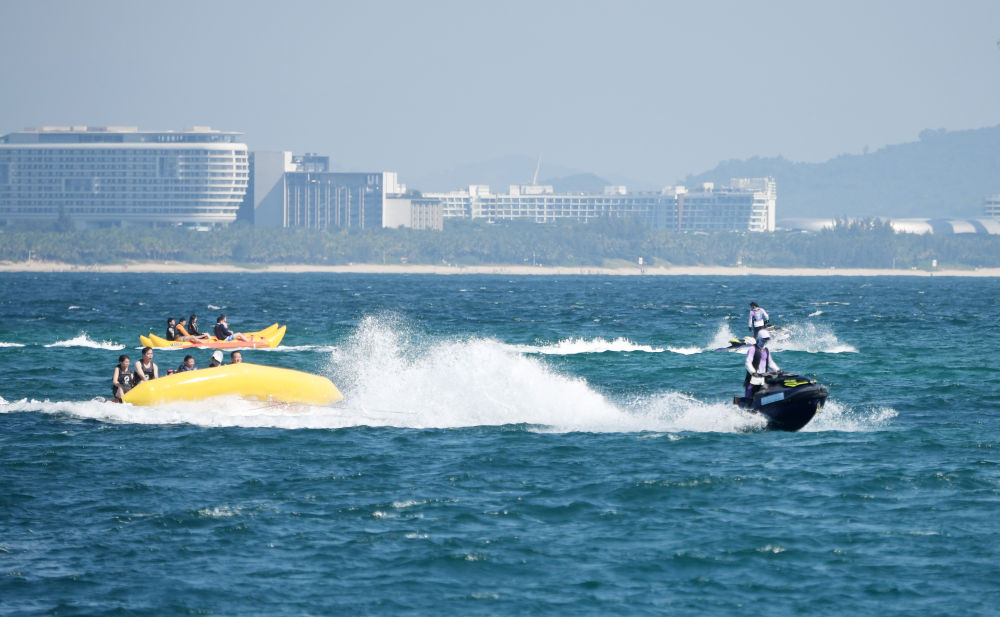 10月4日,在海南三亚蜈支洲岛旅游区,游客体验海上项目。新华社记者赵颖全 摄