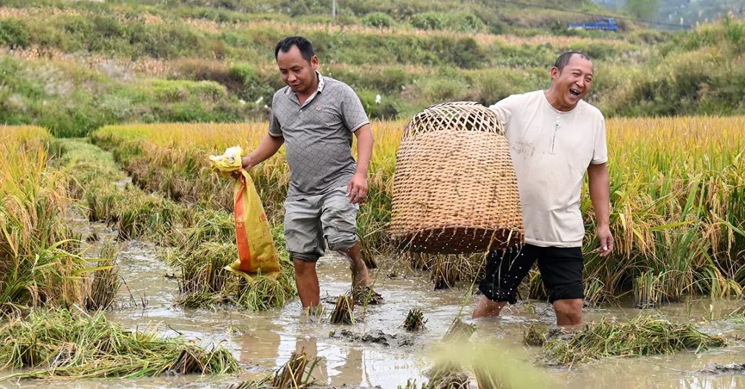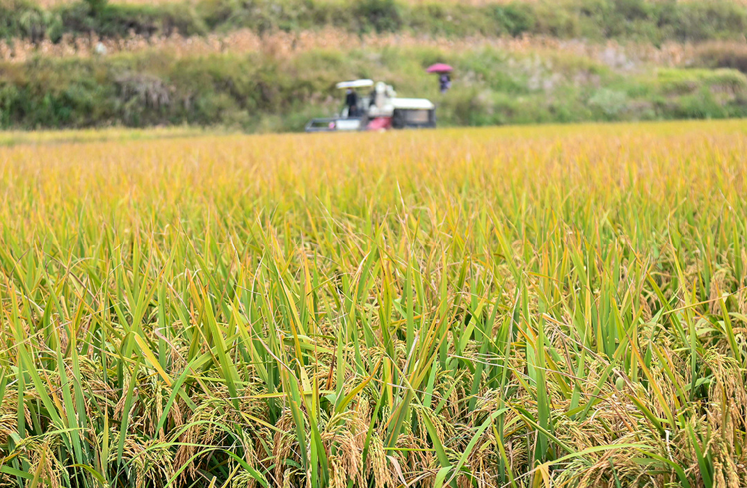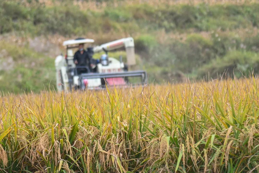 秋收时节,稻穗随风摇曳,鱼儿在田间跳跃。近日,在松桃苗族自治县盘石镇禾梨坪村,村民驾驶收割机采收水稻,水稻采收完毕后,大家又下田捉鱼。