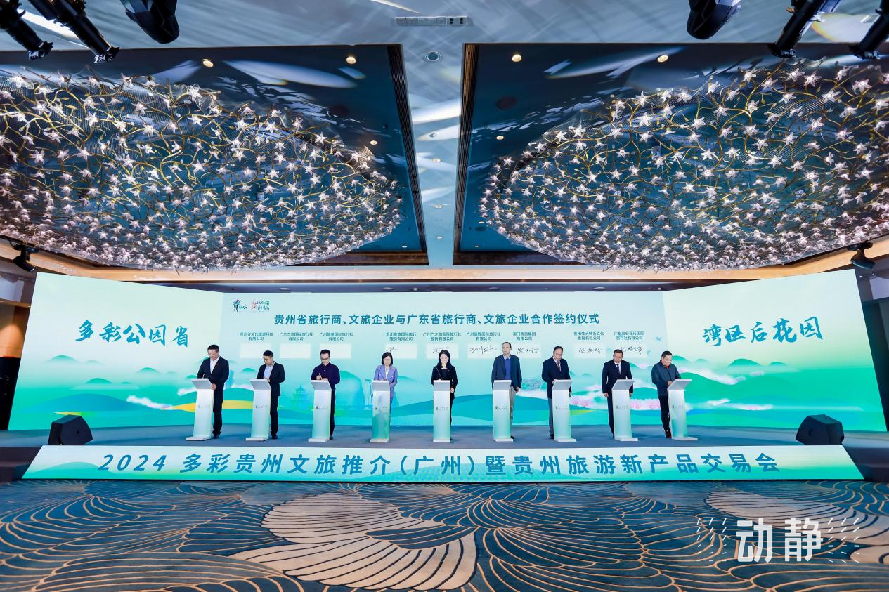 会上,贵州省与广东省旅行商、文旅企业举行了合作签约仪式,并启动了来贵州·上春山“百万老广游贵州”活动;黔东南州、贵阳长征数字科技艺术馆“红飘带”、《伟大转折》剧目、广州广之旅国际旅行社分别作了推介;贵旅集团向广州康辉国际旅行社、广州广之旅国际旅行社股份有限公司授牌。