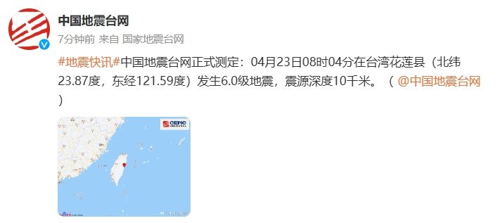 中国地震台网正式测定:4月23日8时4分在台湾花莲县(北纬23.87度,东经121.59度)发生6.0级地震,震源深度10千米。