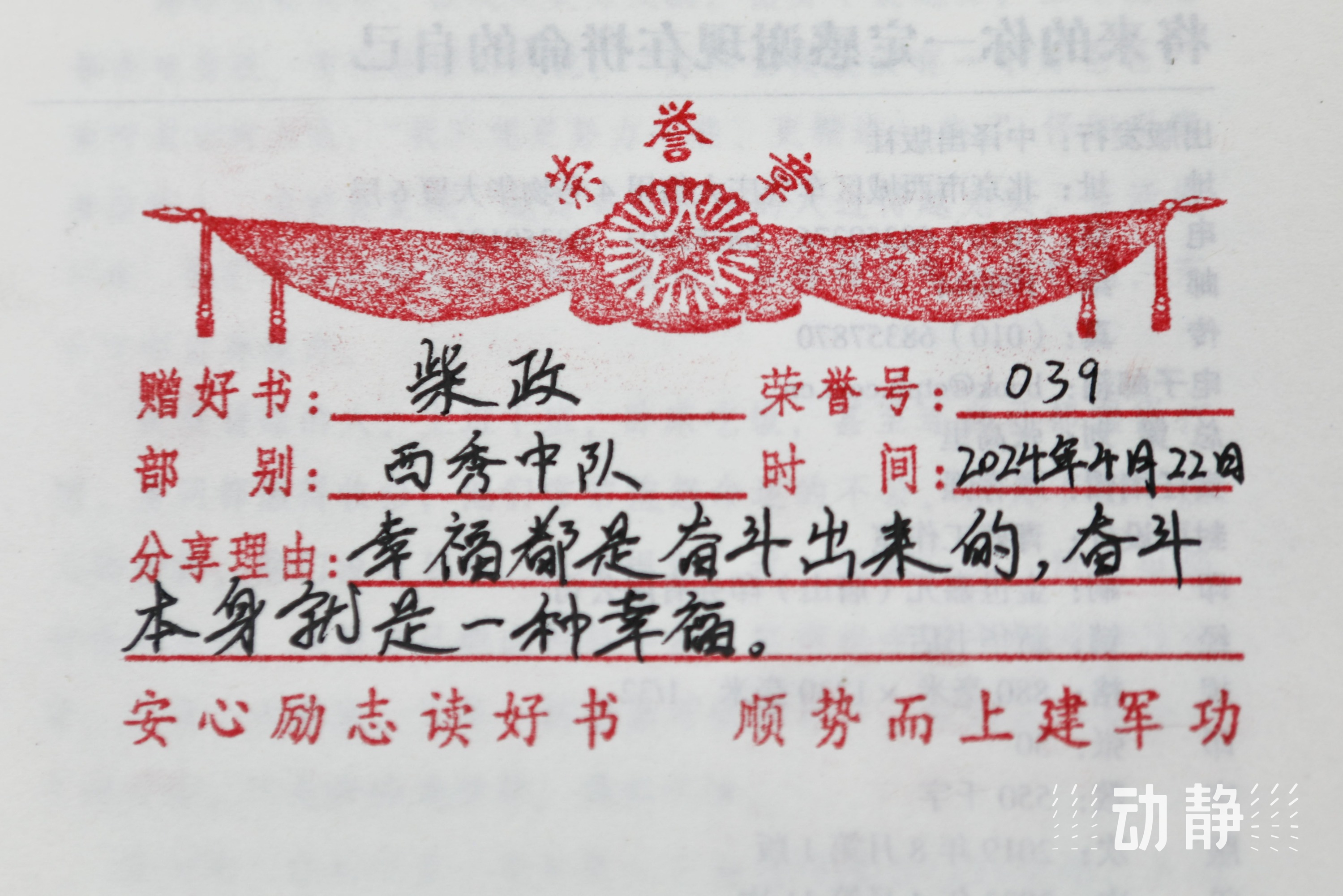在“荣誉·读书分享会”活动中,支队还设立了荣誉书柜,将官兵一致认可的优质图书纳入其中,并为推荐人颁发荣誉证书,形成“我为中队赠一书、中队为我颁证书”的双向奔赴,让好的图书常留部队。