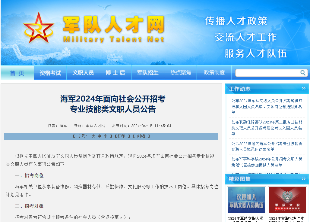2024年海军面向社会公开招考专业技能类文职人员工作最终解释权归海军政治工作部文职人员局。