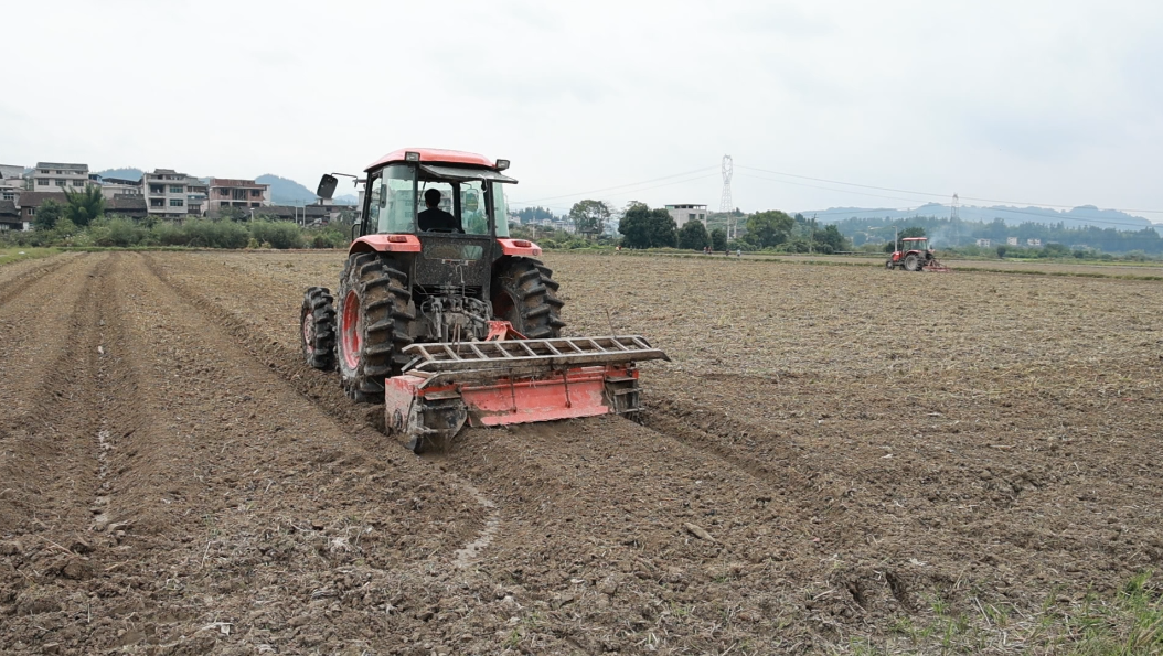 除了种苗培育以外,在中潮镇坪坝村500亩坝区,两台耕田机也正忙着把刚刚丰收的稻田进行翻犁,现场井然有序。