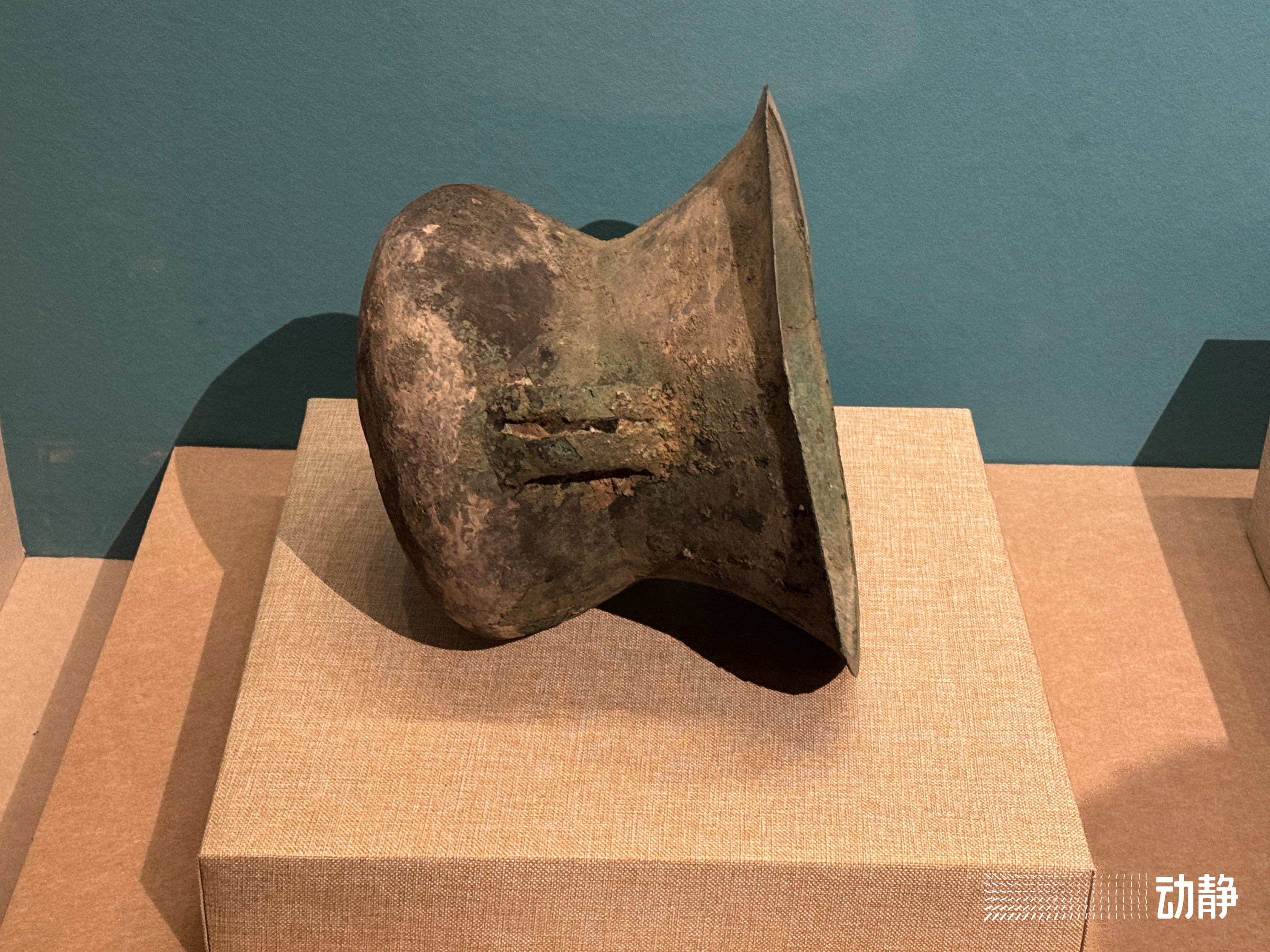 这是一个鼓形铜釜。它有一个大大的敞口,形状像喇叭。别看它长得其貌不扬,可大有来头!这是在毕节市赫章可乐遗址出土的珍贵文物,是“套头葬”的主要器具之一。