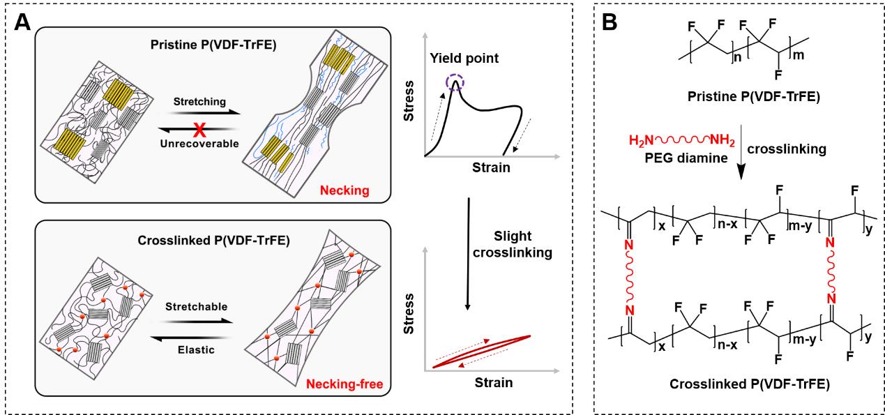 制备弹性铁电材料的方法被团队称之为“微交联法”。传统的铁电材料主要为线性结构,排列规整的部分形成结晶区提供铁电性,而剩余的分子链相互缠绕在一起。由于线性的分子链间没有共价连接,一旦施加外力,这种相互缠绕就会解开,进而导致结晶区被破坏,影响其铁电性。研究团队采用“微交联法”,用微量的柔软链状聚合物,让铁电晶体周边非晶的缠绕部分交联起来,相互交织形成具有弹性的渔网状结构。这种渔网状结构松散地将铁电晶体连接在一起,在外力作用时,可以产生可逆的形变来吸收外力,避免外力对结晶部分的破坏,进而使材料在一定拉伸范围内依旧能够保持稳定的铁电性。而在外力撤销时,这种弹性的渔网状结构能够回复至初始状态。此外,通过精确控制交联剂的用量,可以确保铁电晶体能够均匀地分布在交联网络中,使材料在交联后也能保持较好的铁电响应。