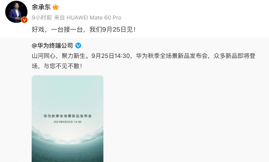 随后,华为常务董事、华为终端公司CEO余承东转发了这则消息,并表示“好戏,一台接一台,我们9月25日见!”。