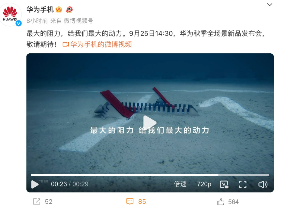 华为手机官方账号也对发布会进行了预热,发布了一小段深入海沟的视频,最后列出的标语是“最大的阻力,给我们最大的动力”。这也暗示公司解决了芯片问题,手机业务全面回归。