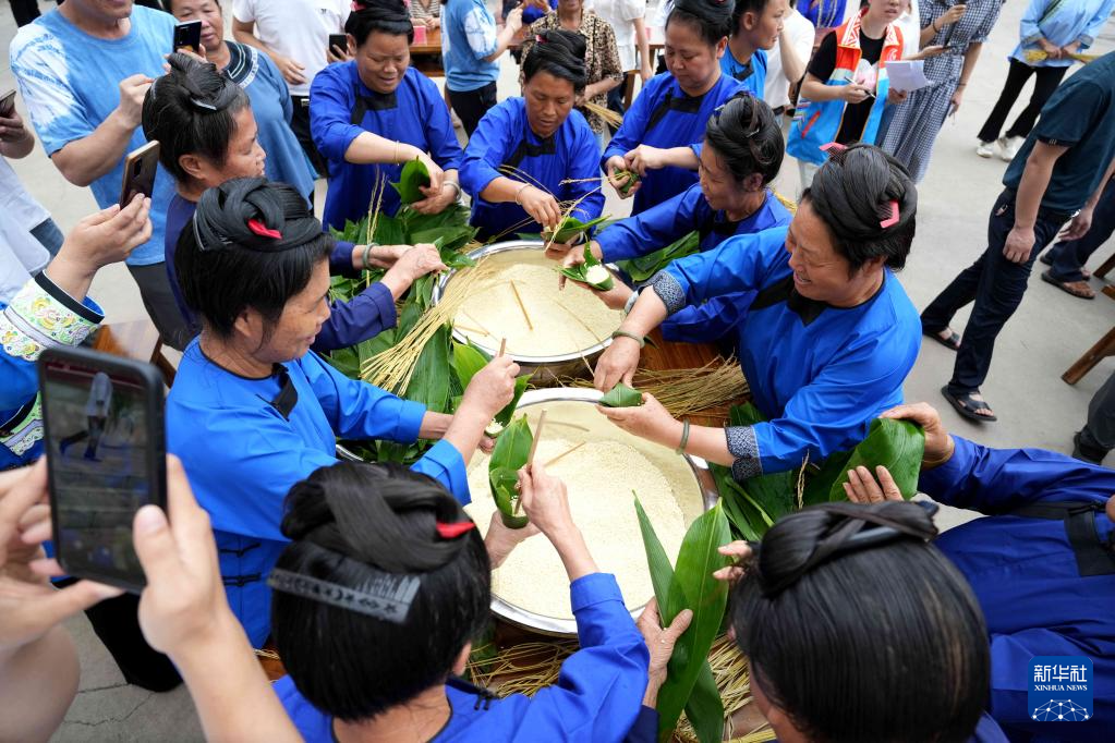 6月20日,在贵州省榕江县新市民活动中心,居民参加包粽子比赛。新华社发(王炳真 摄)