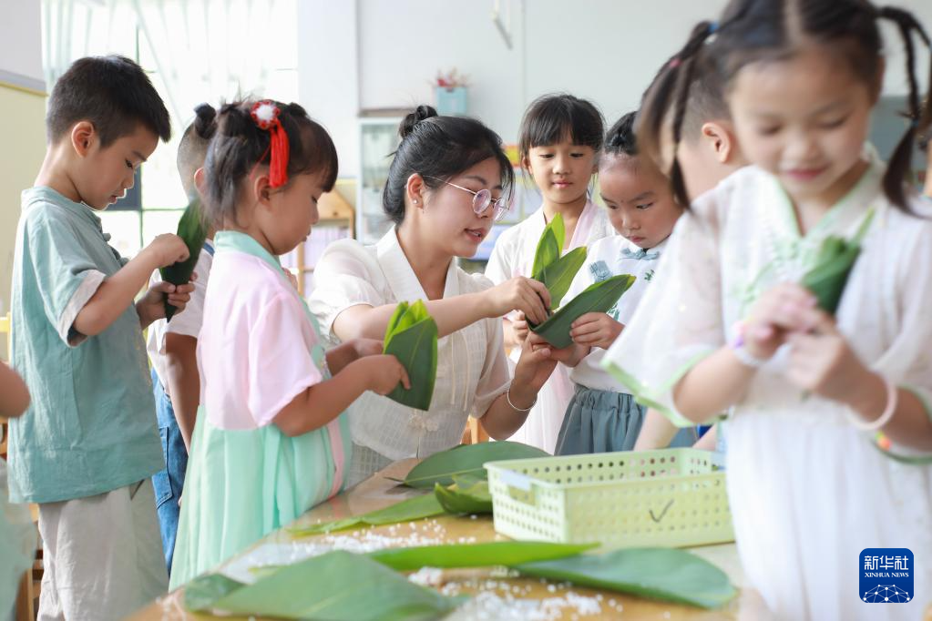 6月20日,在贵州省黔东南苗族侗族自治州岑巩县第二幼儿园,老师在教小朋友包粽子。新华社发(罗慧 摄)