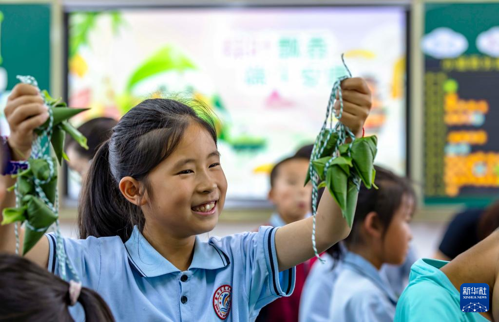 6月20日,贵州省黔西市惠风学校一名学生展示包好的粽子。新华社发(范晖 摄)