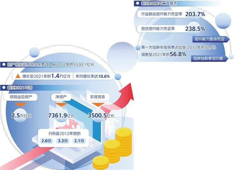 来自银保监会的数据显示,截至2021年底,财险业总资产2.5万亿元,净资产7361.9亿元,实收资本3500.5亿元,分别是2012年底的2.6倍、3.3倍和2.1倍,近十年年均增长率分别为11.1%、14.3%和8.5%,行业资本实力显著增强。截至2022年二季度末,行业核心偿付能力充足率203.7%,综合偿付能力充足率238.5%,偿付能力整体充足。