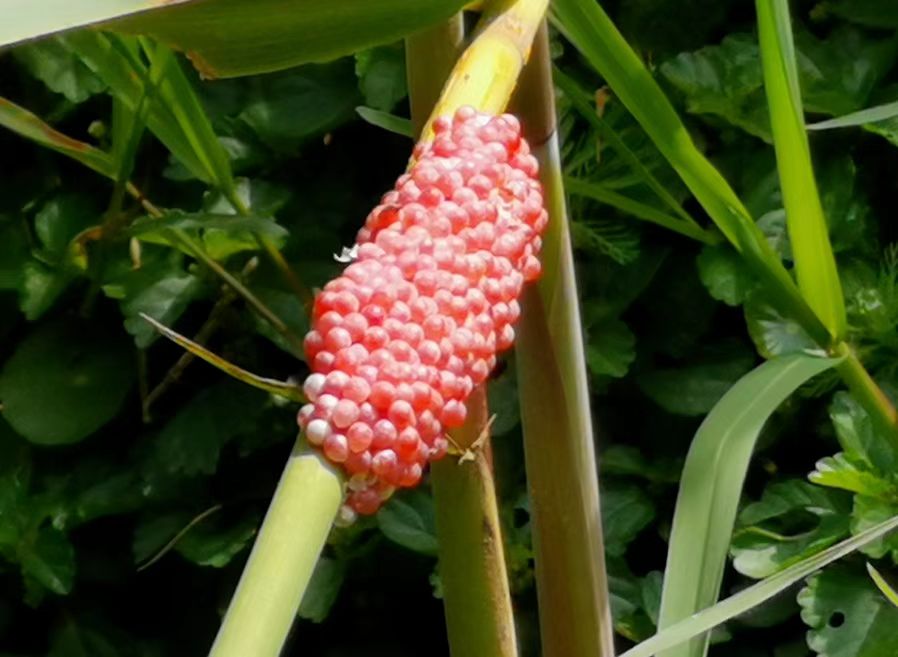 ▲近日,贵阳市民反映在观山湖区阅山湖公园的水库边,发现很多“红宝石”样的卵块和福寿螺。福寿螺,是一种外来入侵物种,对输入地的生态系统平衡、农业生产和人类健康都会产生危害。专家提醒,切记不要用手直接触碰,可用工具将其铲落碾碎或放到水里,福寿螺卵就无法正常孵化和繁衍。