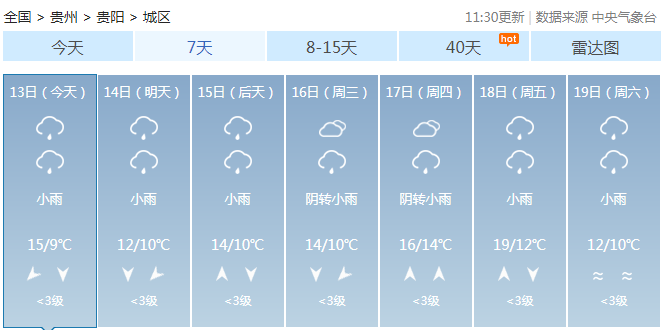 周二,阴天有阵雨,雨量小到中雨,局地有雾,主城区气温10~15℃;