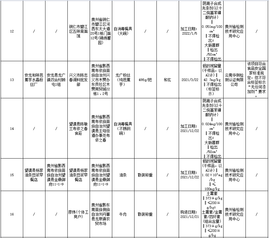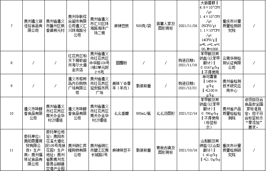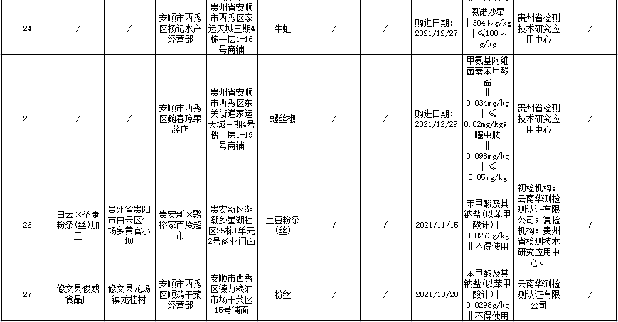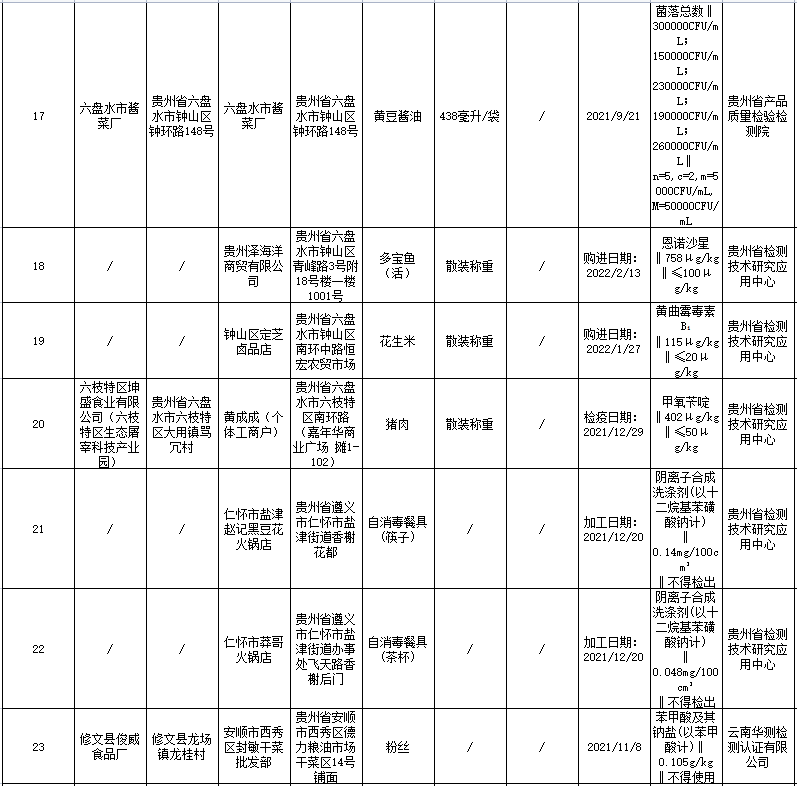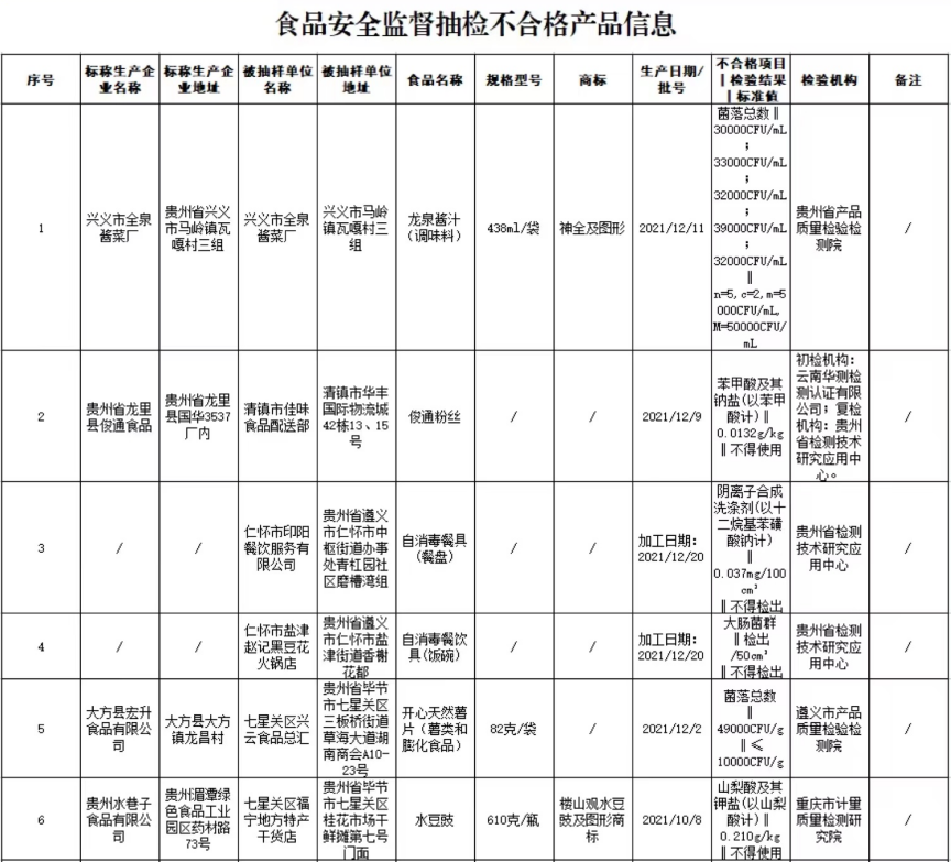 近期,贵州省市场监管局组织食品安全监督抽检,抽取保健食品、餐饮食品、淀粉及淀粉制品、豆制品、肉制品、乳制品、食用农产品、薯类和膨化食品、调味品和速冻食品等10大类食品428批次样品,检出餐饮食品、淀粉及淀粉制品、豆制品、食用农产品、薯类和膨化食品和调味品等6大类食品27批次样品不合格。