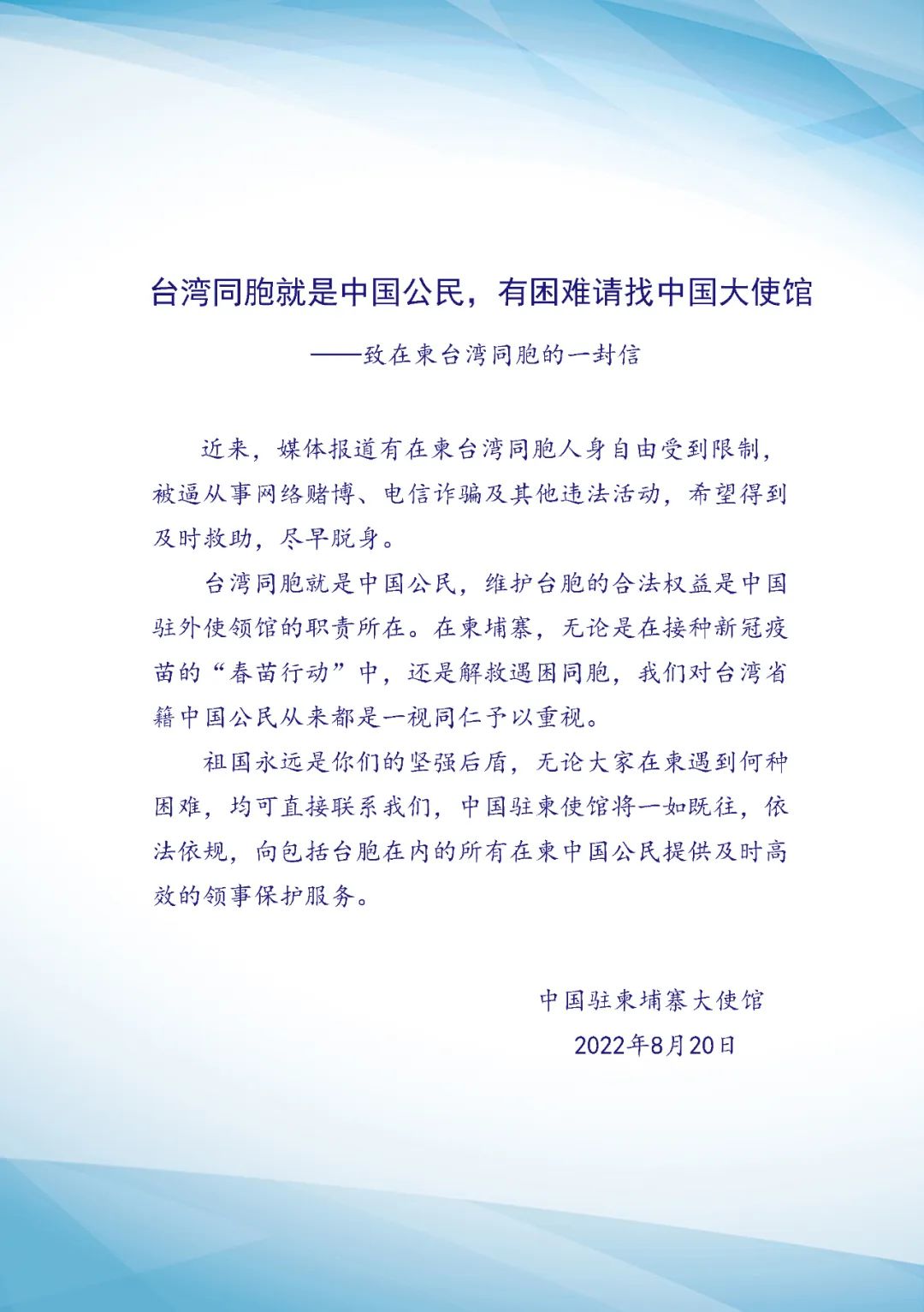 最近一段时间,媒体报道有不少台湾民众遭诱骗赴柬埔寨工作被囚禁、殴打,引发高度关注。8月20日,中国驻柬埔寨大使馆发布致在柬台湾同胞的一封信,信中表示,台湾同胞就是中国公民,有困难请找中国大使馆。