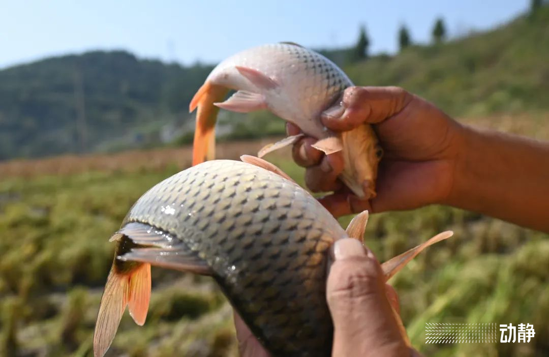 金秋时节,松桃苗族自治县盘石镇迎来一年丰收季,村民们忙于在稻田里采收稻谷和捉稻花鱼,一派繁忙的丰收景象。