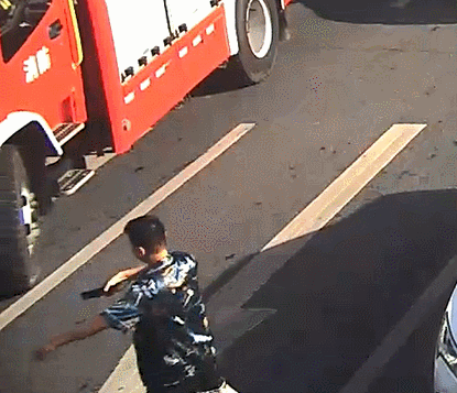 一边向消防车驾驶员挥手示意